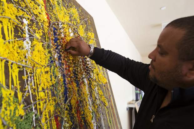 Mirabal creates sculptural paintings that use non-traditional materials like rice, bullets, keys and barbed wire. He is best known for his series of flag paintings that recreate the Cuban and American flags in chunky drips of paint and clusters of glued materials on wood. He incorporates emotionally charged objects like bullets and barbed wire, he said, to speak to the historically fraught relationship between Cuba and the U.S.