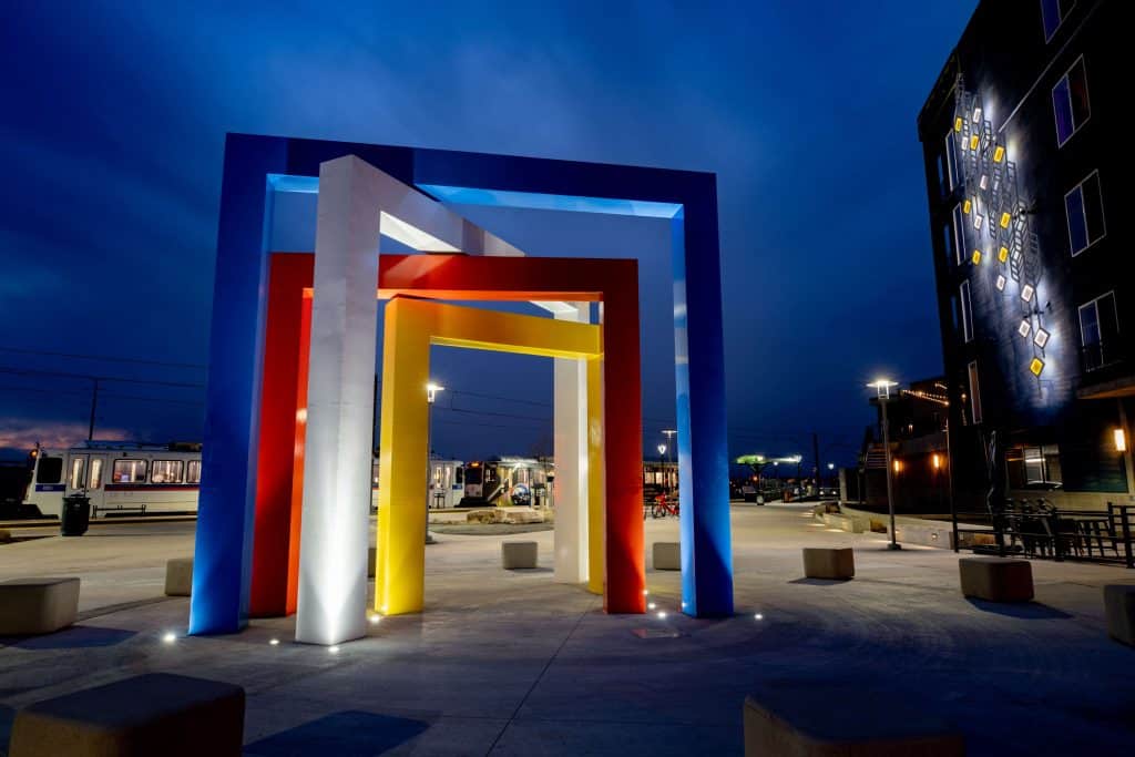 Titled “Four Chromatic Gates,” it stands 16 feet tall at the Alameda light rail station in the growing Broadway Park development and utilizes several of Bayer’s aesthetic signatures: it is geometrical and functional, its four nested steel rectangles painted in primary yellow, red and white – topped by the tallest in signature “Bayer blue.”
