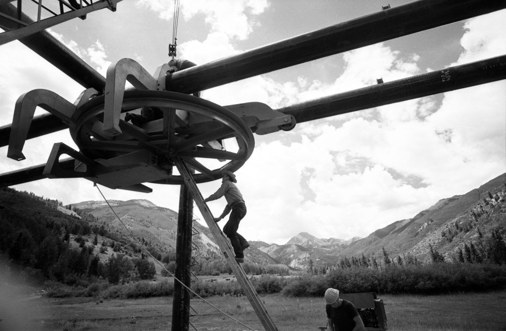 As reported in The Aspen Times, April 27, 1967, “Aspen Skiing Corp. president D.R.C. Brown, Jr. dedicated lift number five at Snowmass-at-Aspen Monday, April 24, which when completed will bring the number of lifts servicing the Aspen area to 27.” It went on to describe “Lift five starts at the Snowmass Camp Ground [sic] and rises to the top of 10,645 foot Sam’s Knob. Marketing manager for Snowmass-at-Aspen John Cooley said, ‘This lift opens up the most challenging ski terrain in the Snowmass area.’ The runs serviced by this lift are also the proposed site of the filming of the $2 million Paramount Studio movie ‘Downhill Racers’. Cooley said he called Steve Alexander, production manager of the film, two weeks ago and was informed that Paramount hopes to start shooting scenes for the movie when the ski season opens the end of this year.” Ultimately, the 1969 movie was not filmed in Snowmass. The new bull wheel is pictured getting built at the lower terminal of the lift in the Snowmass Creek Valley with Mtn Daly in the background, July 1967.
