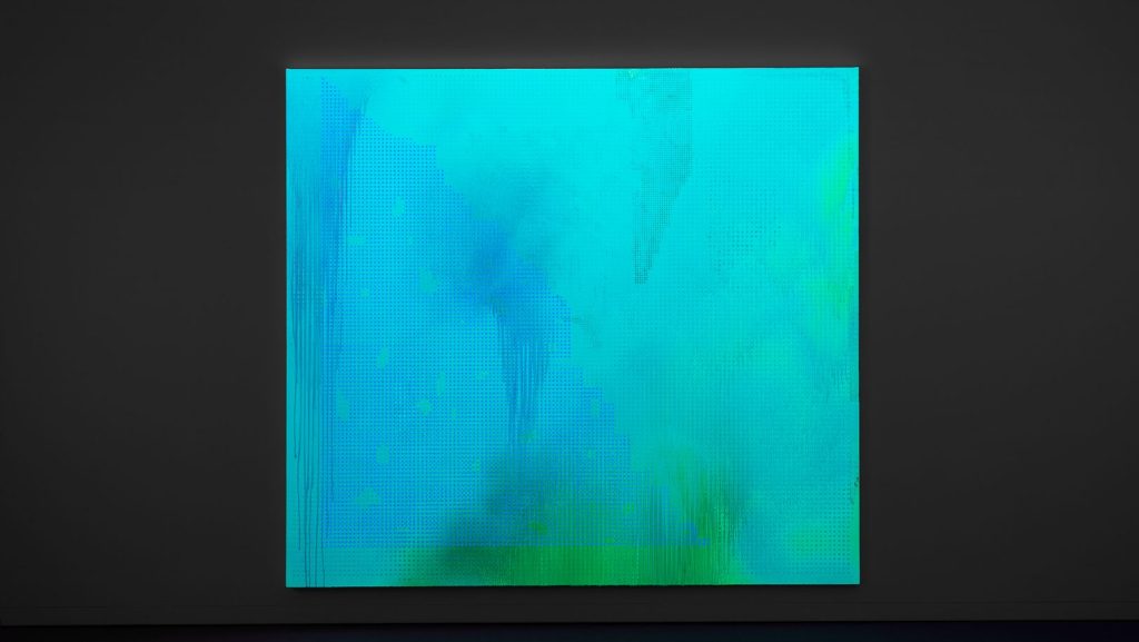 The paintings of Humphries blend modes of expression and communication. Intentionally concealing the process itself with dense, layered compositions, “symbols, logos, emojis, and code mingle with brush marks, paint splatters, and drips, forging links between traditions of abstract painting and life cycles of technology,” according to the release.