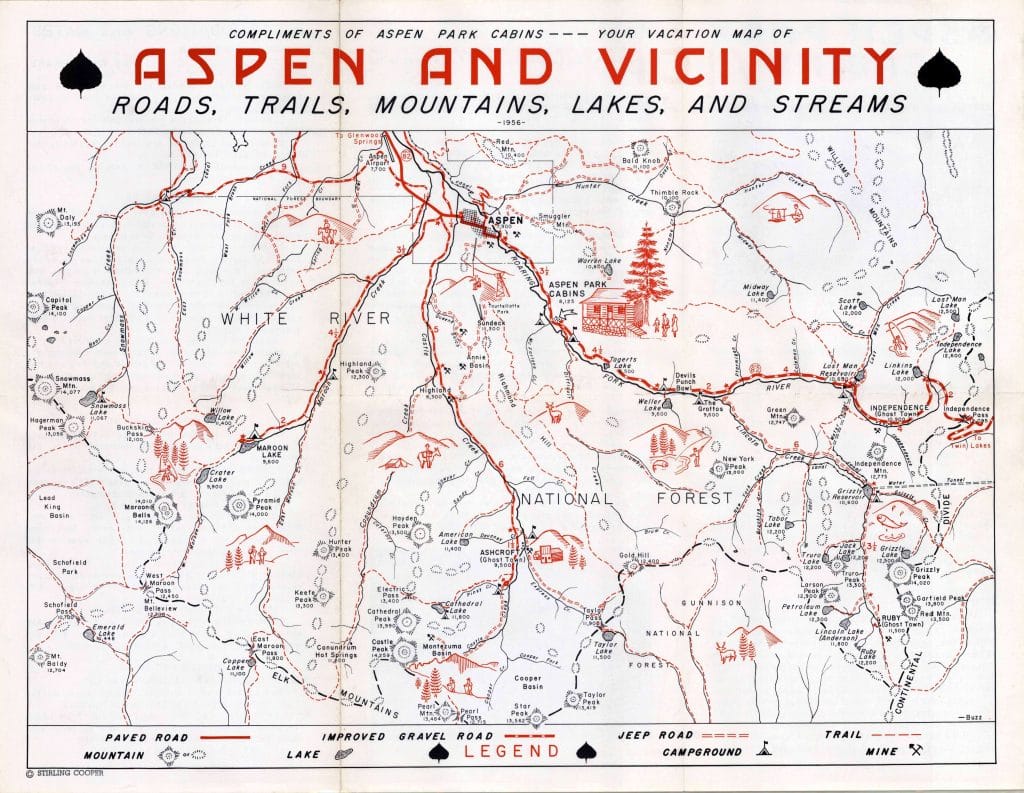The Cooper Cabins, also known as the Aspen Park Cabins, were rented out into the 1950s. Buzz designed a map for guests at the cabins. That 1956 map, which has all the essential landmarks and attractions of the Aspen area, is part of a current display at the Aspen Historical Society.