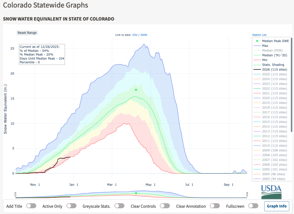 As of Dec. 25, Colorado’s statewide snowpack stood at just 3.2 inches of snow-water equivalent and had reached the zeroth percentile, or its lowest point in at least the past 30 years, according to the U.S. Department of Agriculture’s snowpack telemetry, or SNOTEL, system.