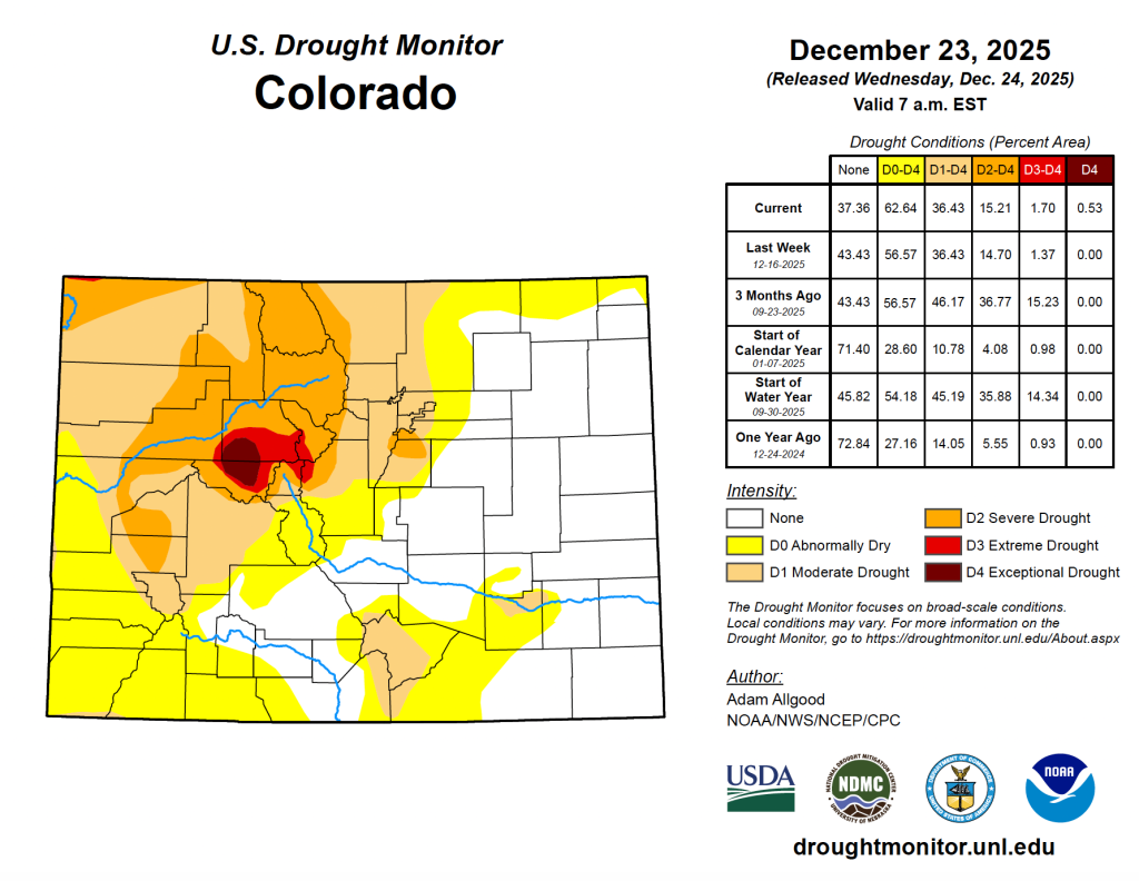 The small amounts of rain, which totalled just a tiny fraction of an inch, did little to improve the drought conditions present across Colorado’s Western Slope. Exceptional and extreme drought conditions are present in Eagle and Pitkin counties, with extreme drought pushing into Summit County and moderate-to-severe drought spreading across the northwest corner of the state, according to the U.S. Drought Monitor.