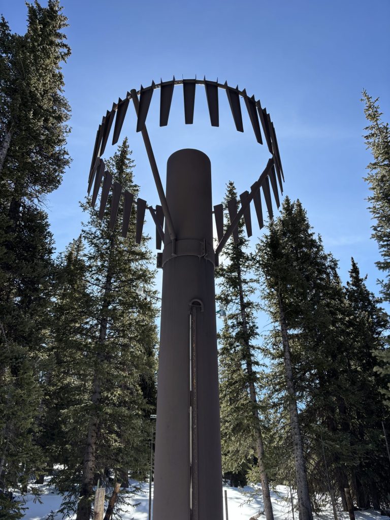 Each telemetry station also has a precipitation gauge, which measures all types of precipitation, including rain, sleet, and snow, as it falls, according to Domonkos. Because Colorado’s dry conditions result in snow that is often very light, he said precipitation gauges are outfitted with an “altershield” — or a circle of metal plates that swing in the wind — to slow the wind down, so that snow doesn’t get blown out of the gauge.