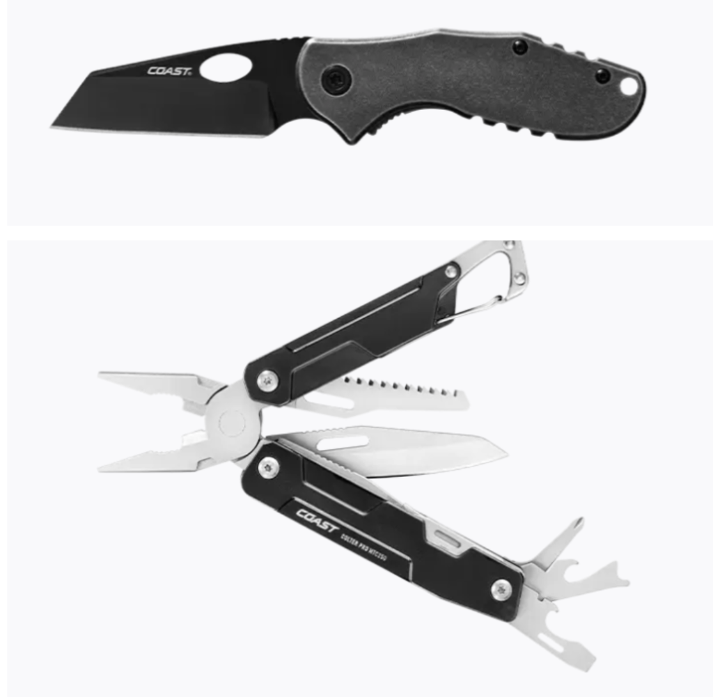 A multi-generational family business, Coast has been making high-quality knives since 1919. The company began with helping fishermen on the coast of Oregon. I actually used the 2.4-inch steel blade to open the Colter Pro Multi-tool — you know that super-hard-to-open, hard-plastic packaging you sometimes encounter? Well, the knife cut right through it. It’s made of durable steel with black titanium nitride coating to keep the knife sharp and resistant to corrosion. Weighing just 3.1 ounces, it includes a pocket clip and a small lanyard hole to access the knife in a snap. It’s easy to pull out (it’s just over 6 inches long when extended) and fold back in. And when I say easy, I mean it; just press the flipper tab to extend the knife with one hand, no effort needed — it also has a thumb hole to pull if you prefer. Its contoured handle feels nice in hand and provides a secure grip if your hands are wet. The stainless steel Colter Pro 12 multi-tool includes spring-loaded, long-nose pliers that also act as wire cutters, one-handed opening blades, and a host of other tools, including a saw blade, knife blade, Phillips screwdriver, a can opener, a flathead screwdriver that also acts as a bottle opener, and a carabiner. I find all of the tools easy to open, except the flathead screwdriver, located in the middle of two tools, but it’s not really hard — just not as easy as the others. These tools are amazing, and the prices are also amazing for what you get. Knife, $29.99; multi-tool, $34.99, coastportland.com.