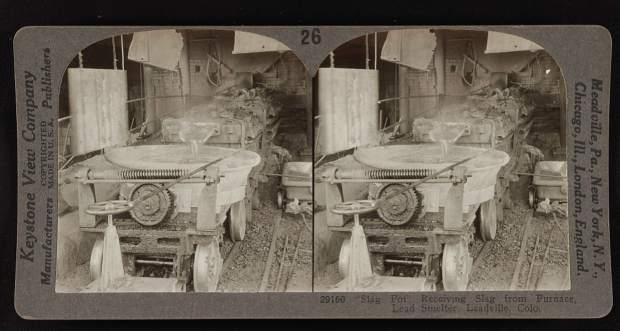 Hardinge fired up his second furnace and began to process 60 tons of ore daily. He experimented with adjustments to accommodate Aspen’s ore composition. About 30 employees shoveled ore and coal and operated the plant. They first shoveled three or four tons of charcoal into the furnace and fired it up with the air blowers. That took about four hours. Then they sealed the furnace and the temperature rose further. The heat melted a quantity of lead that had been left in the furnace and some old slag. When the system got hot enough to melt silver ore, workers shoveled in that precious ingredient. The molten material drained slowly — slag oozed into slag carts and silver slid like a twinkling stream into troughs.