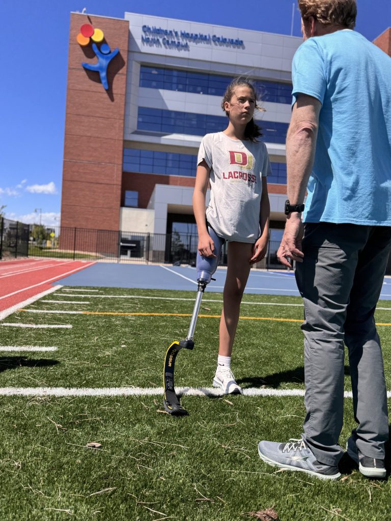 Annabelle Carlson trying out her running blade for the first time at Children’s Hospital of Colorado.