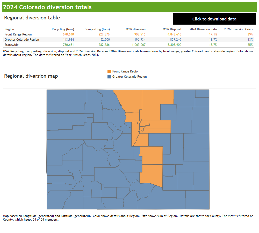The 2017 goals included different targets for the Front Range (39% by 2026) and the rest of Colorado (13%). As of Dec. 31, 2024, the Colorado Department of Public Health & Environment reported 17.1% diversion in the 11 Front Range counties and 13.7% in the remaining 53 counties.