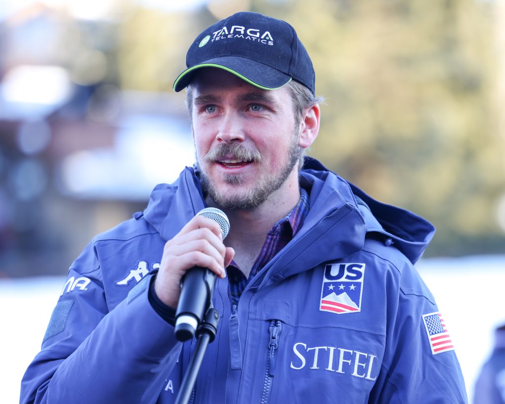 Edwards ski racer River Radamus talks to the crowd during the World Cup bib draw ceremony on Thursday, Feb. 29, 2024, at Snowmass Base Village. Austin Colbert/The Aspen Times