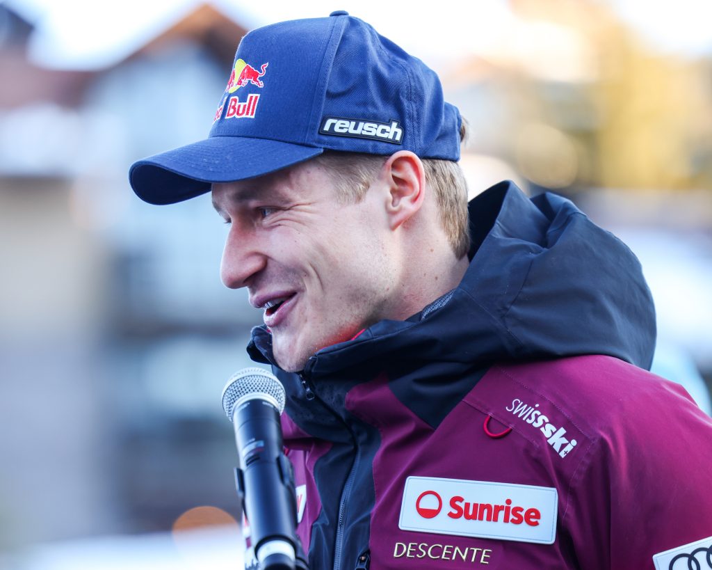 Switzerland’s Marco Odermatt talks to host Chris Davenport (not pictured) during the World Cup bib draw ceremony on Thursday, Feb. 29, 2024, at Snowmass Base Village. Austin Colbert/The Aspen Times