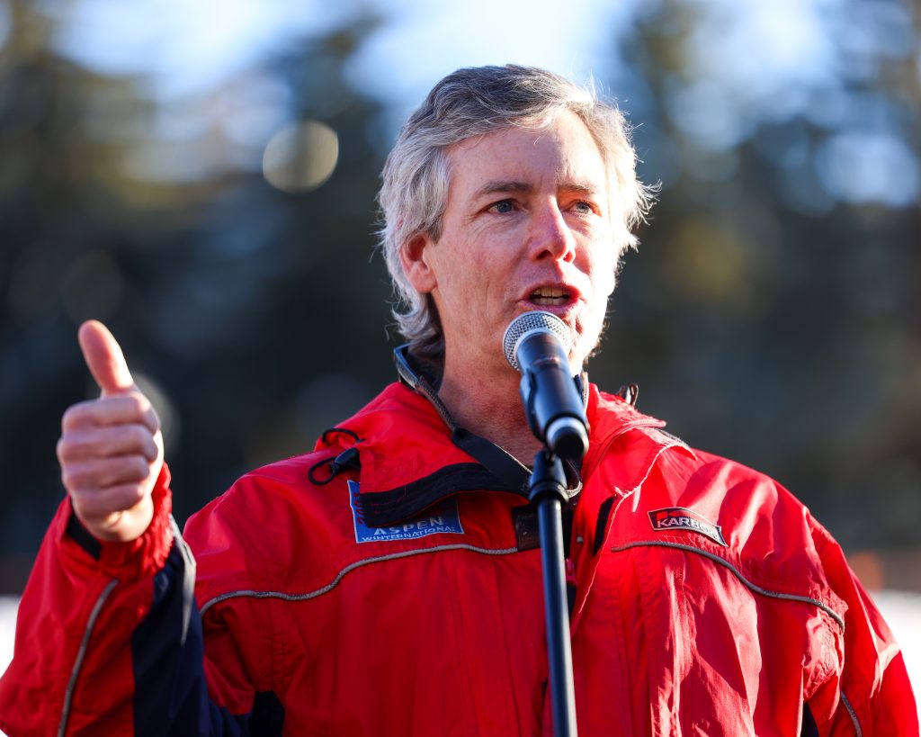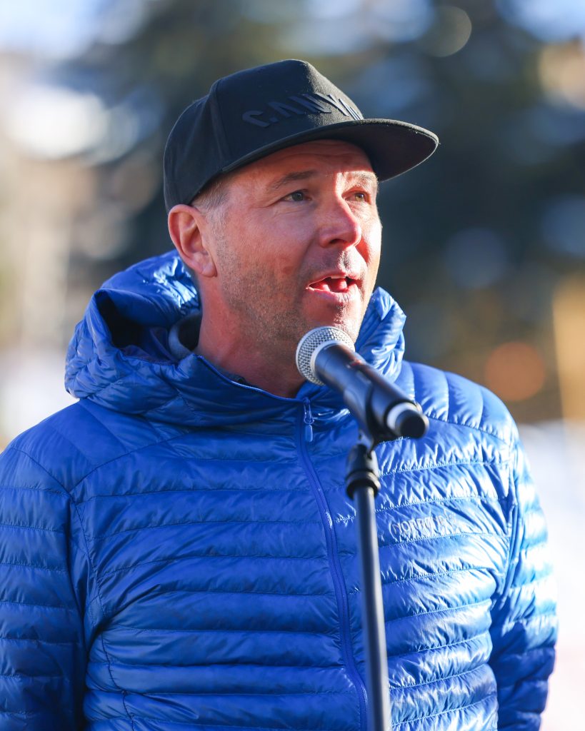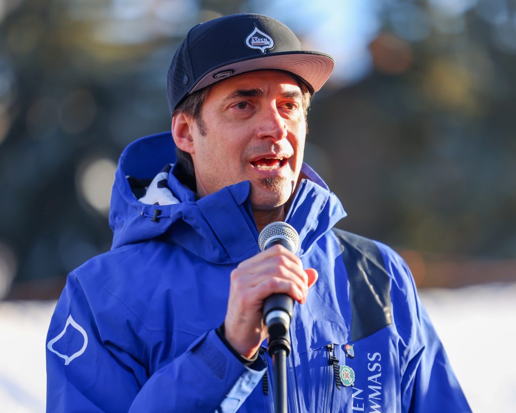 Aspen Skiing Co. CEO Geoff Buchheister gives a few remarks during the World Cup bib draw on Thursday, Feb. 29, 2024, at Snowmass Base Village. Austin Colbert/The Aspen Times