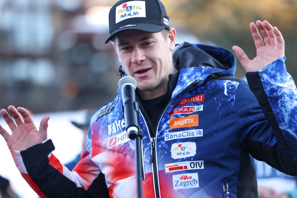Croatia’s Filip Zubčić talks to the crowd during the World Cup bib draw ceremony on Thursday, Feb. 29, 2024, at Snowmass Base Village. Austin Colbert/The Aspen Times